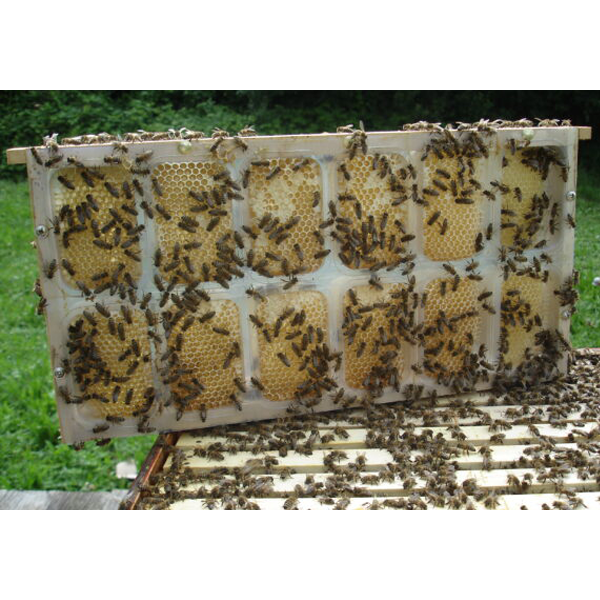 The bottom of the box has honeycomb texture on which bees continue to build honeycomb, without the need to insert a part of honeycomb foundation or wax. When boxes are filled, they are taken out easily, closed with the lid and ready to be sold as a natural dessert.